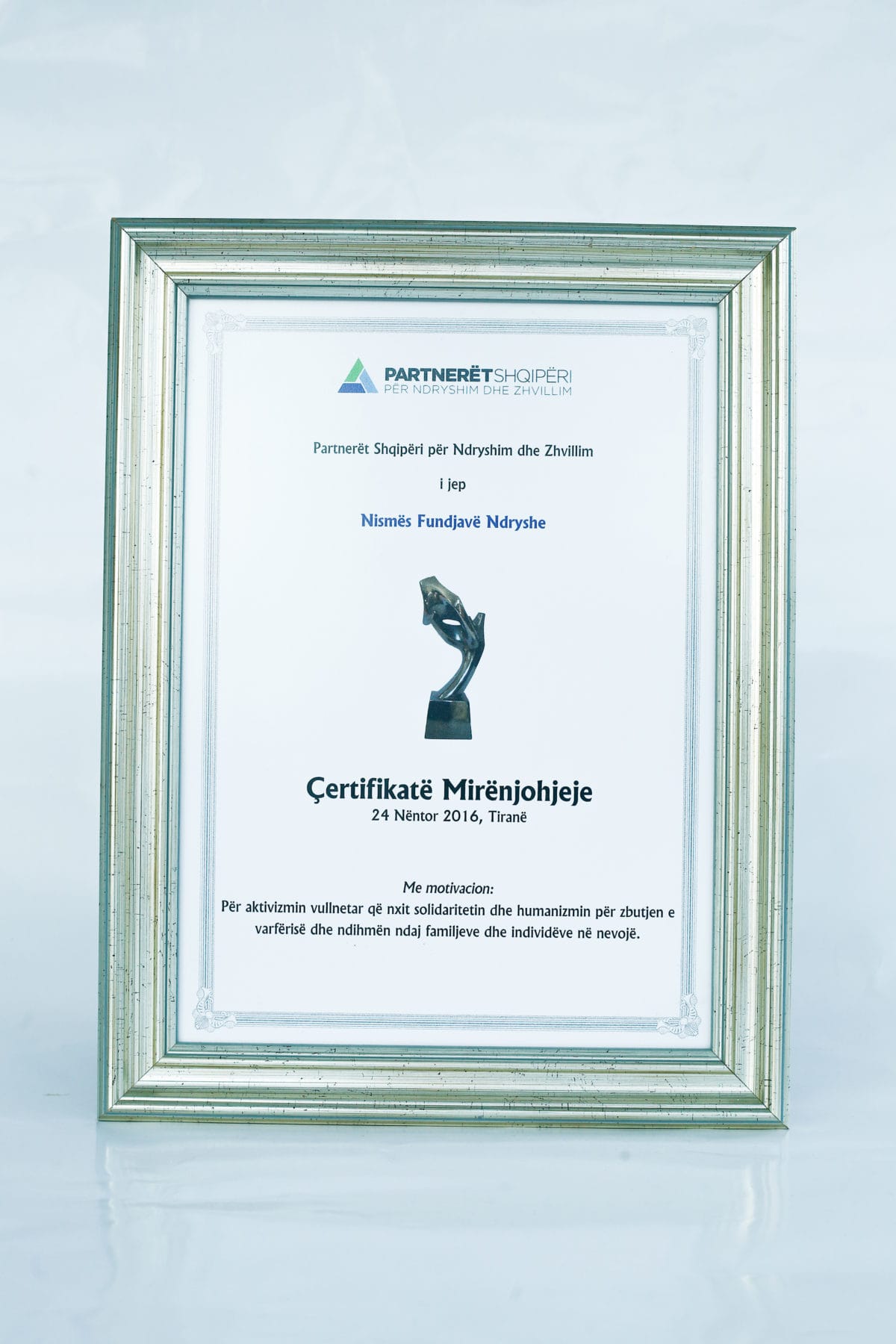 Partners in Albania awarded a certificate of appreciation to “Fundjavë Ndryshe” for their help to families and people in need and their volunteering activities that encourage solidarity and humanism in Albania.
