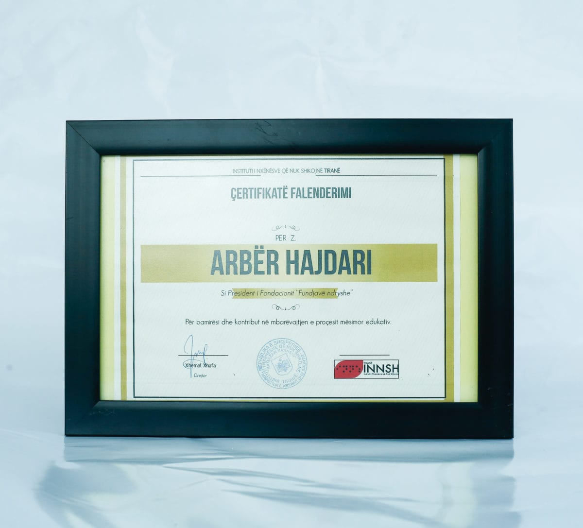 This certificate is given to Mr.Arbër Hajdari from the “Institute of children who cannot see”,for the contribution of “Different Weekend” in the academic process.